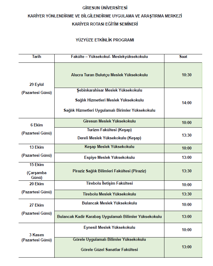 Kariyer Yönlendirme ve Bilgilendirme Uygulama ve Araştırma Merkezi Müdürlüğümüz tarafından, öğrencilerimizin kariyer gelişimlerine katkı sunmak ve Kariyer Merkezi faaliyetlerimiz hakkında bilgilendirme yapmak amacıyla Üniversitemiz birimlerinde yüz yüze gerçekleştirilecek “Kariyer Rotası” başlıklı kariyer seminerleri düzenlenecektir.